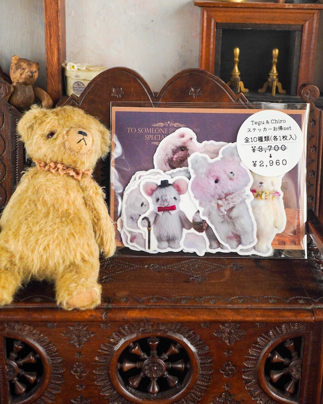 『Tegu&Chiro ステッカー』全種類が入ったお得なセット 全10種類 各1枚ずつ ・クマキノコ ・ヒツジモドキ ・ウサギキノコ ・ネズミキノコ ・ネコキノコ ・角ウサギ ・ヒツジと木馬 ・お出迎えするウサギ ・クマコウモリ ・都会のネズミと田舎のネズミ サイズ:各種違いあり(8cm角に入るサイズ) ・台紙:ヴィンテージ調の風景ポストカード1枚