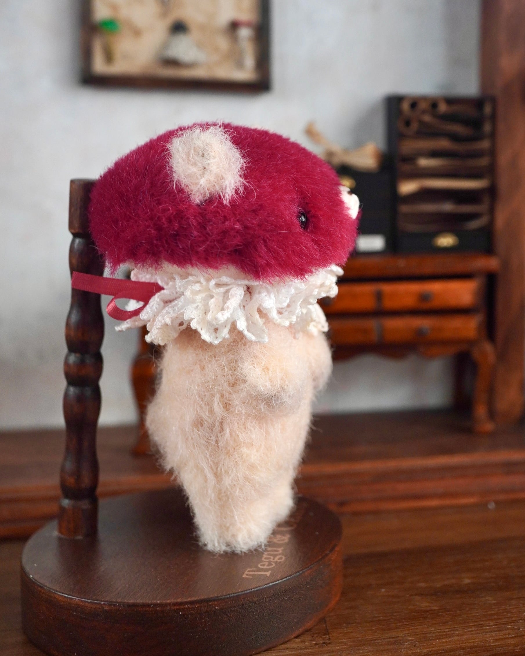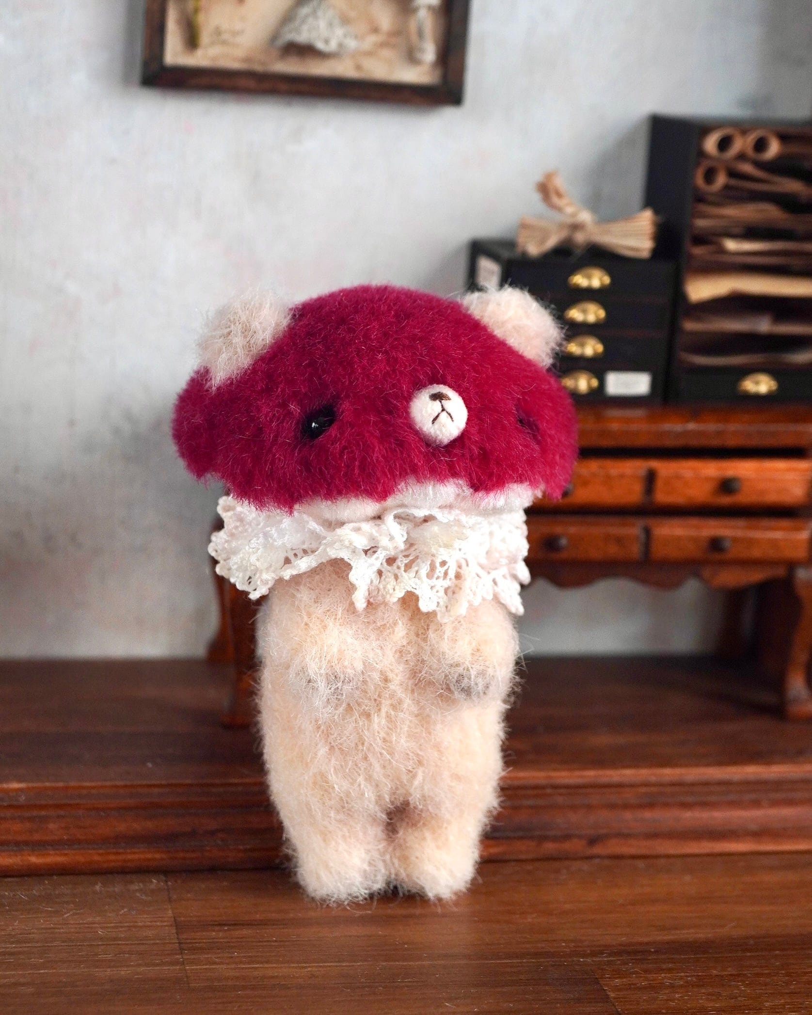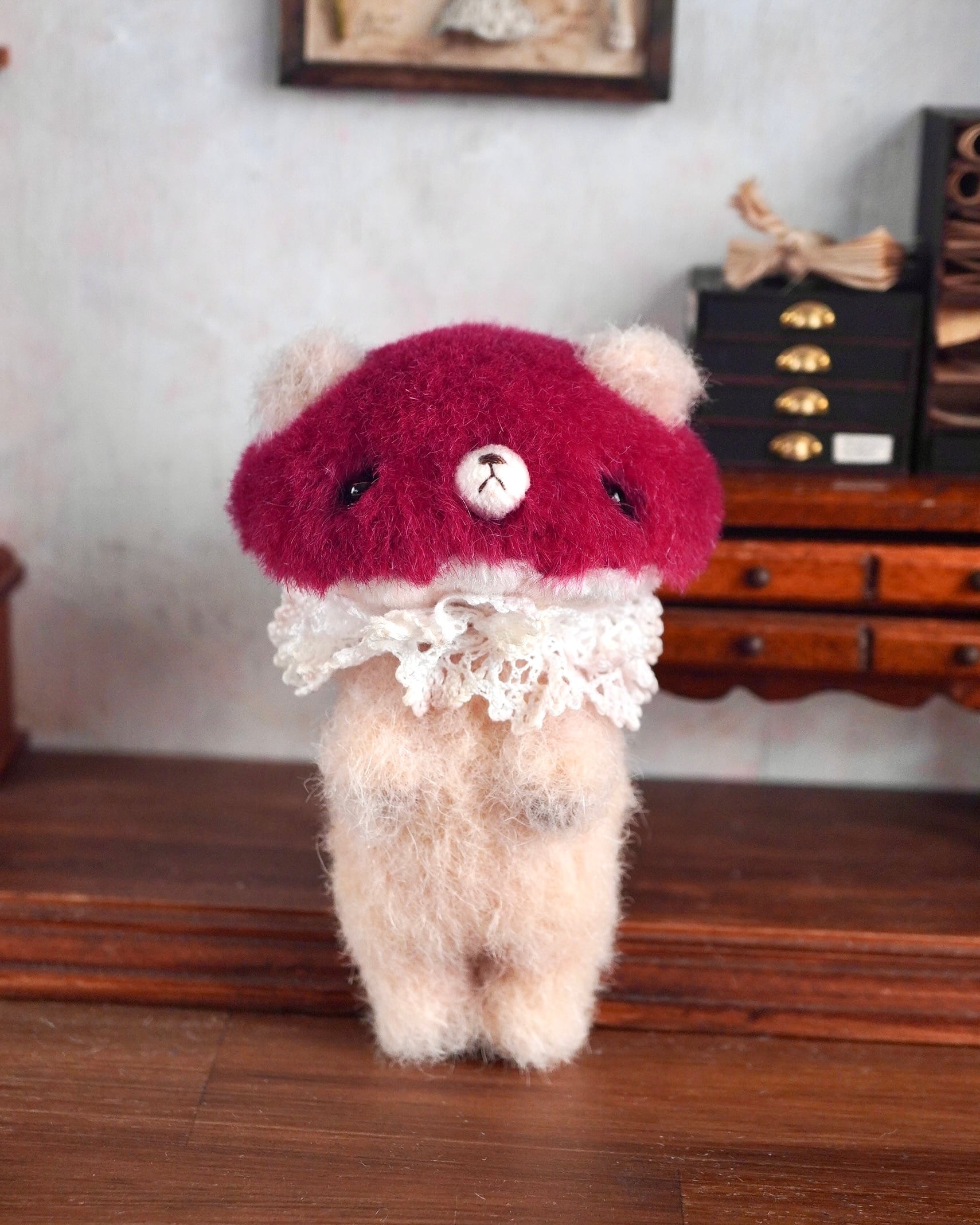 スタンダードなクマキノコさんのカラーですが、同じものはありません。微妙に違う素材や色を使い一点ものとなっています。