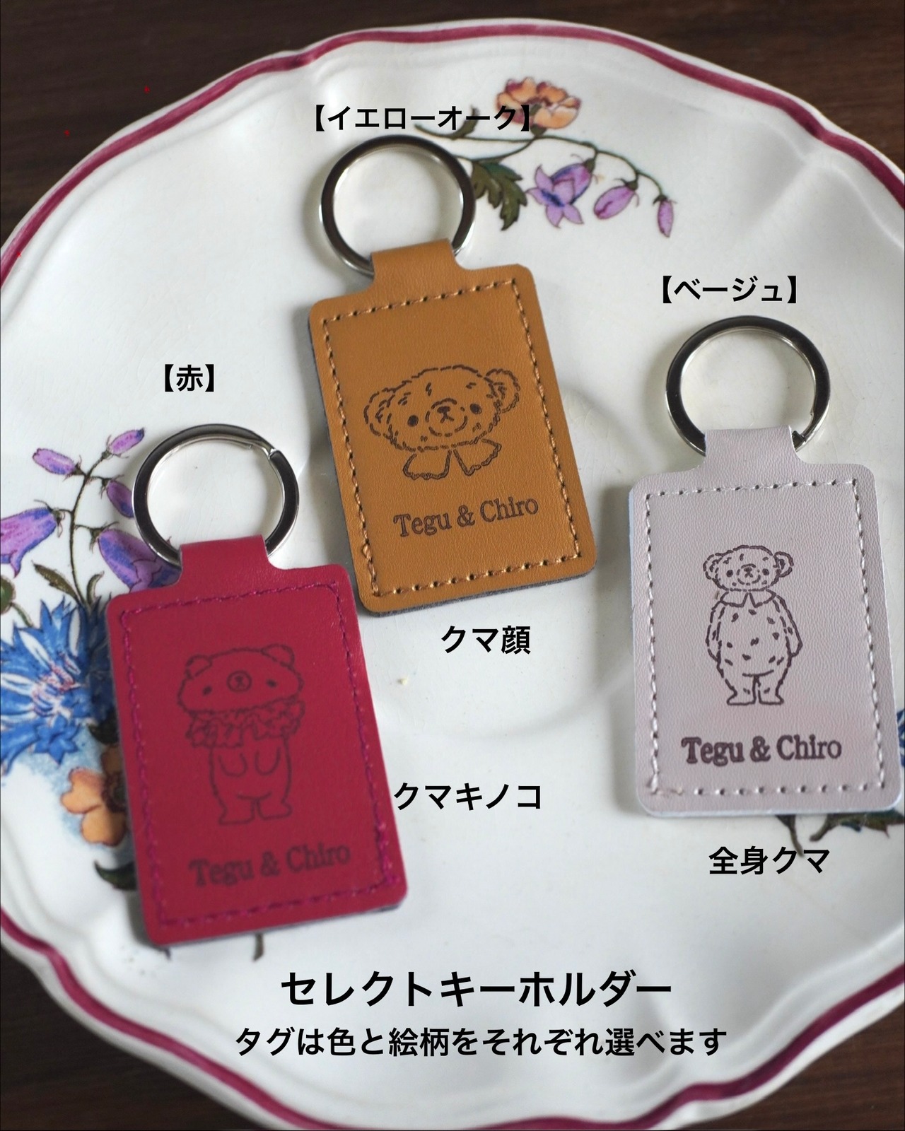 キーホルダーのタグ(合皮)の色と絵柄を選べる