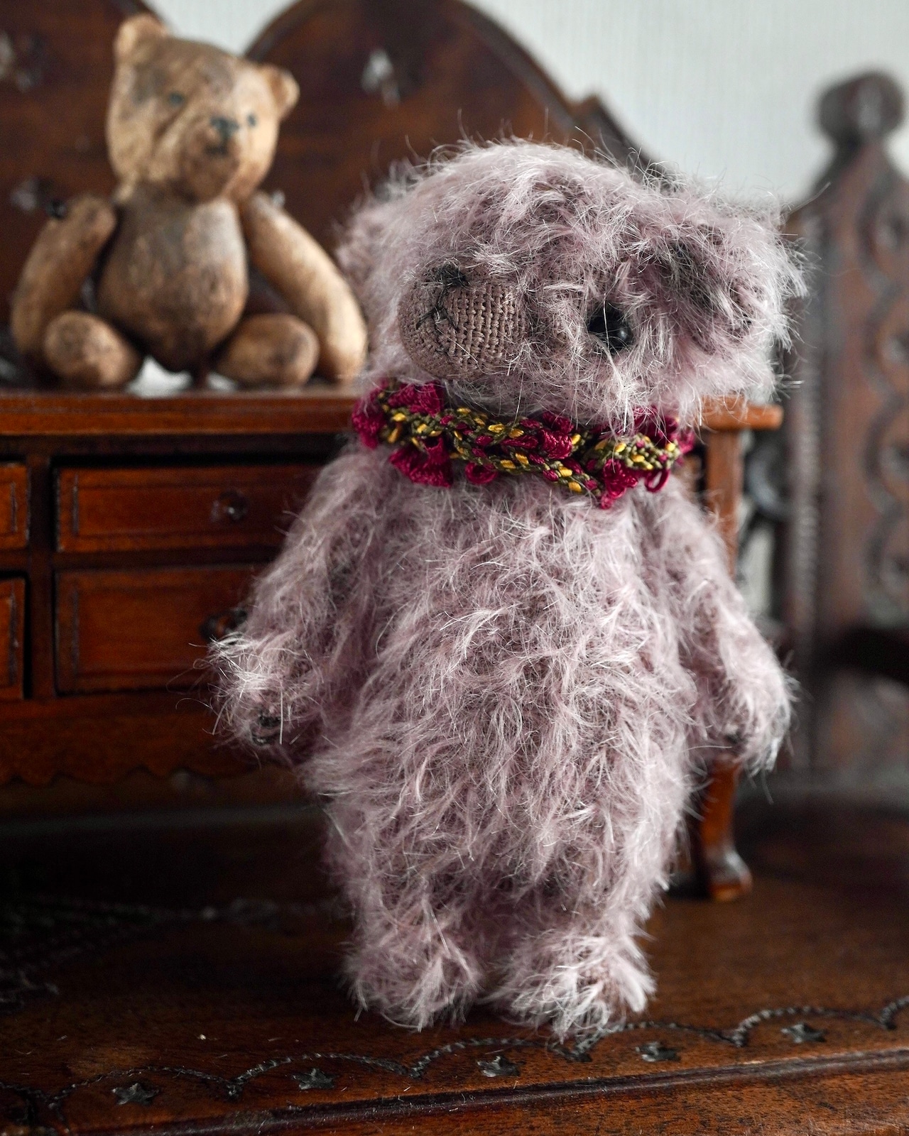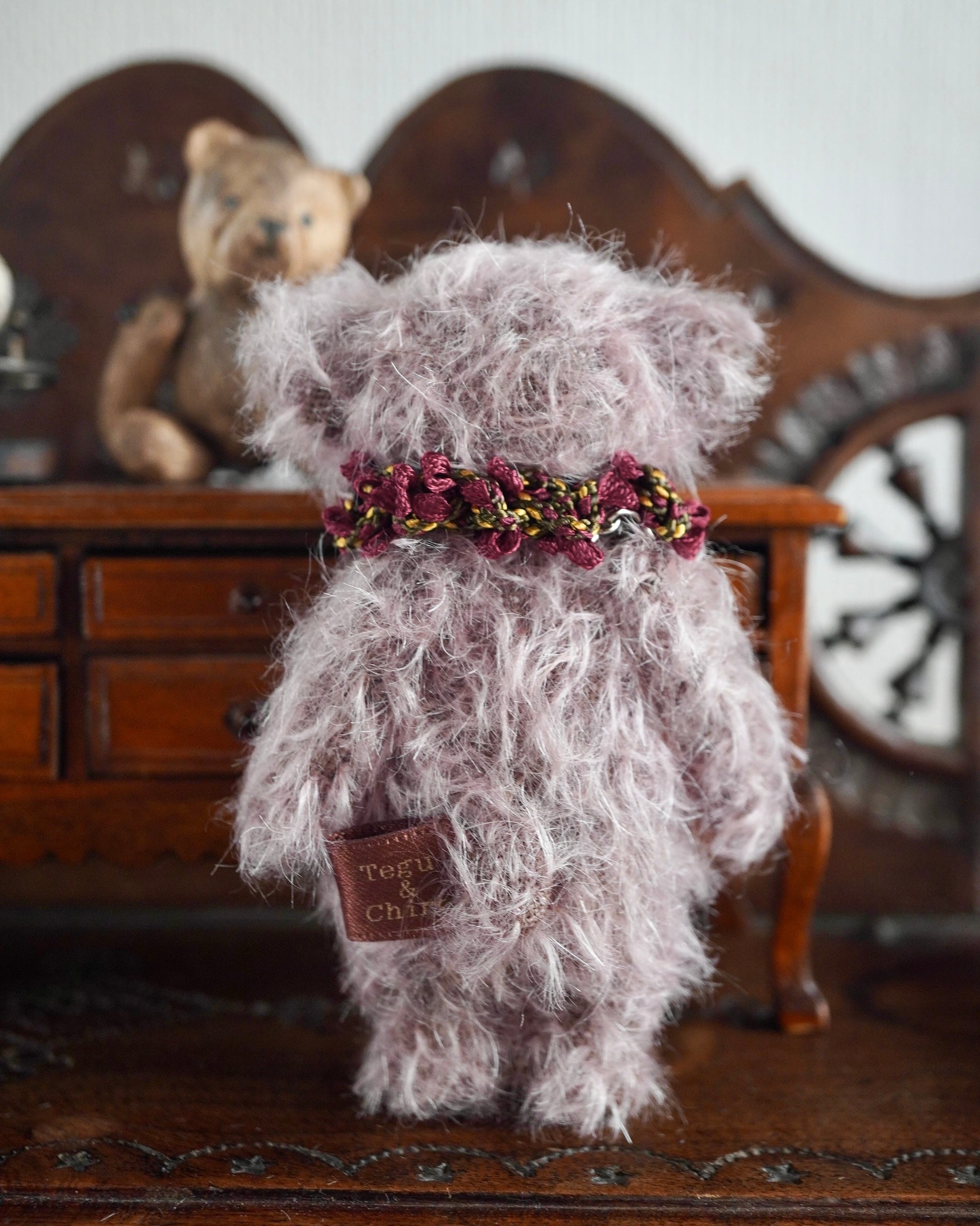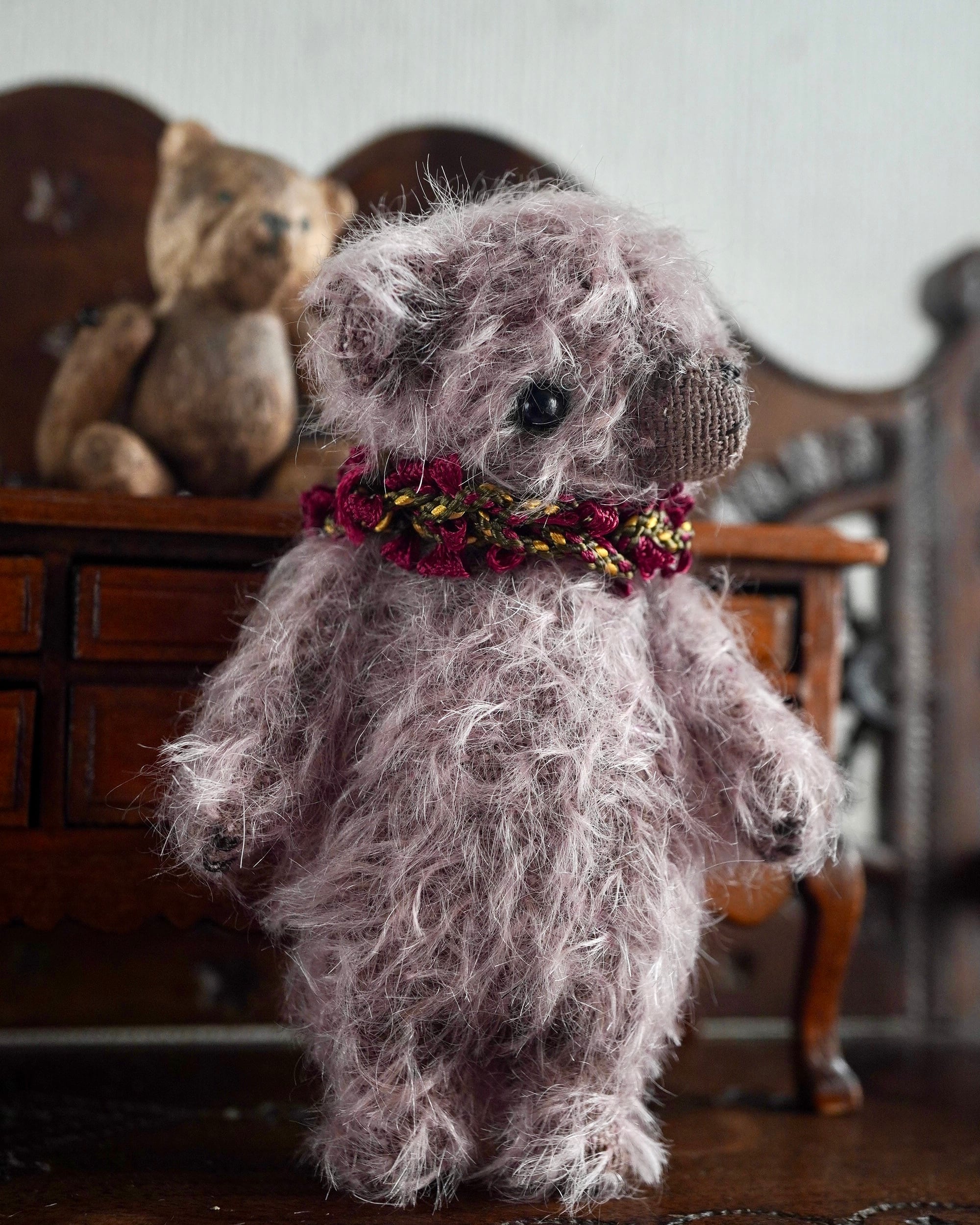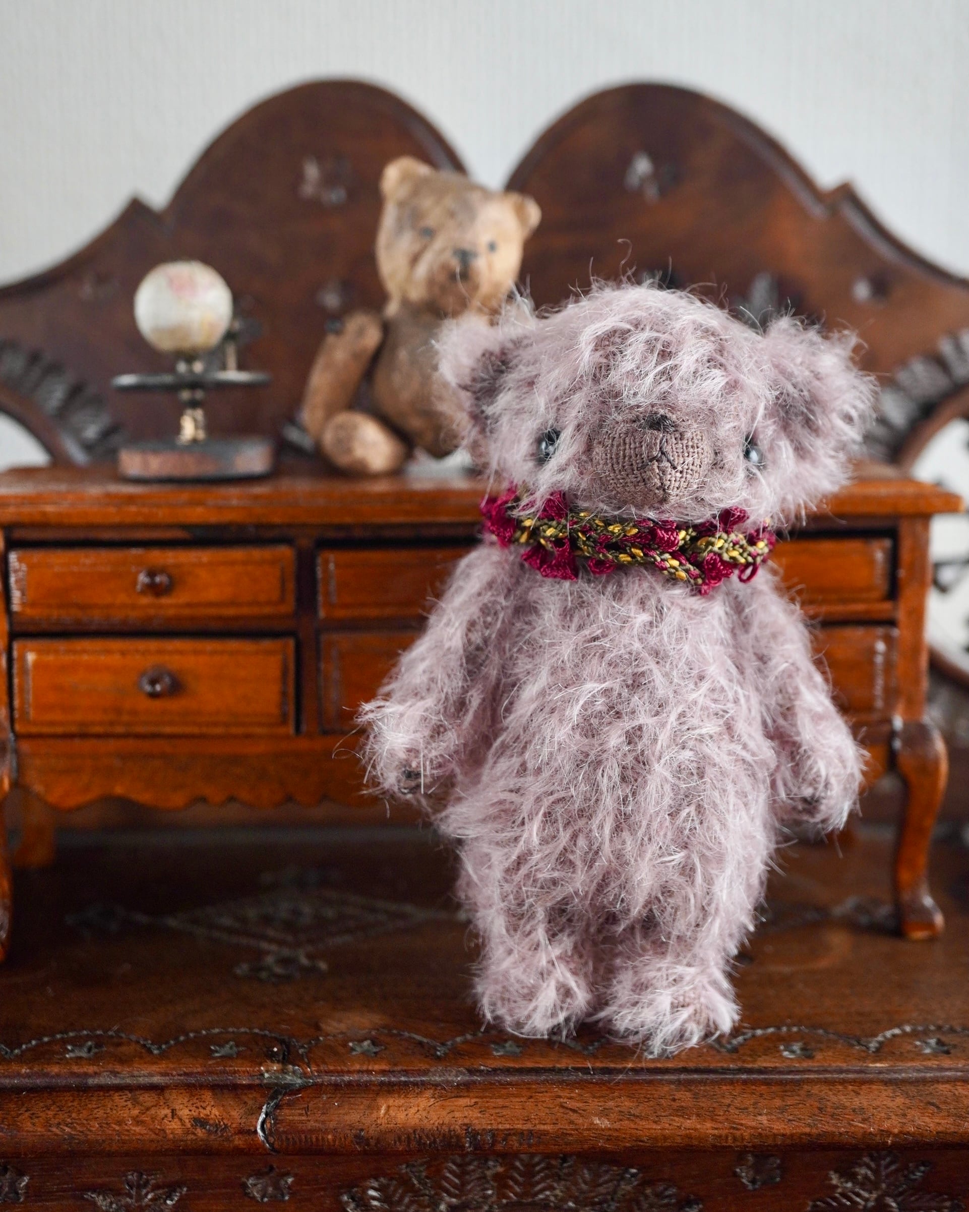 アンティークに似合う落ち着いたカラーのクマさん。私の私物のクマさんと同じ生地で作ったお気に入りのカラーのモヘアです。